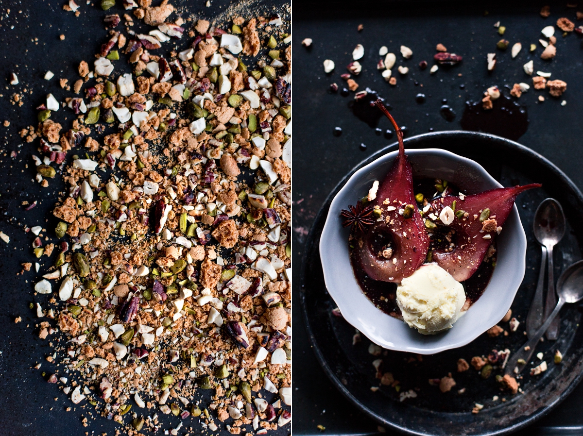 - Diesen Sirup nun bei Seite stellen und auskühlen lassen. Für das Crumble werden die Nüsse und Pistazien in einer Pfanne kurz angeröstet und nach dem auskühlen grob gehackt. Amarettini leicht zerbröseln und darunter mischen.