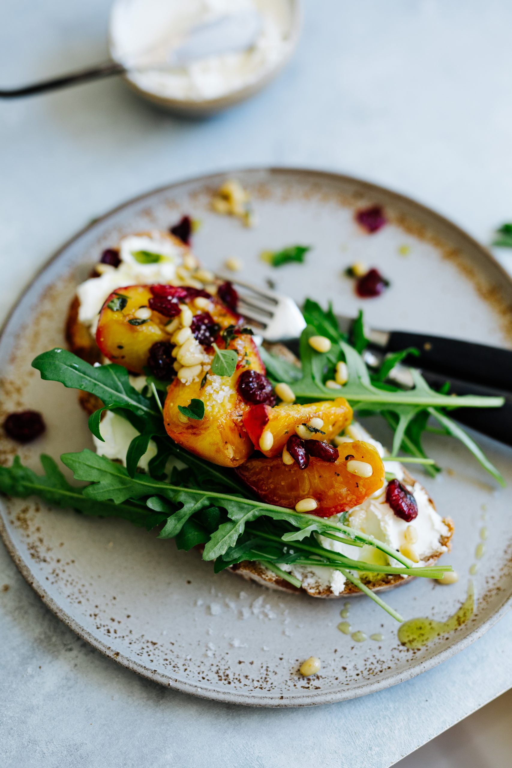 - Eine Scheibe Brot großzügig mit Labneh bestreichen und mit Rucola belegen. Die warmen Pfirsiche darauf geben und mit Buntem Pfeffer bestreuen.