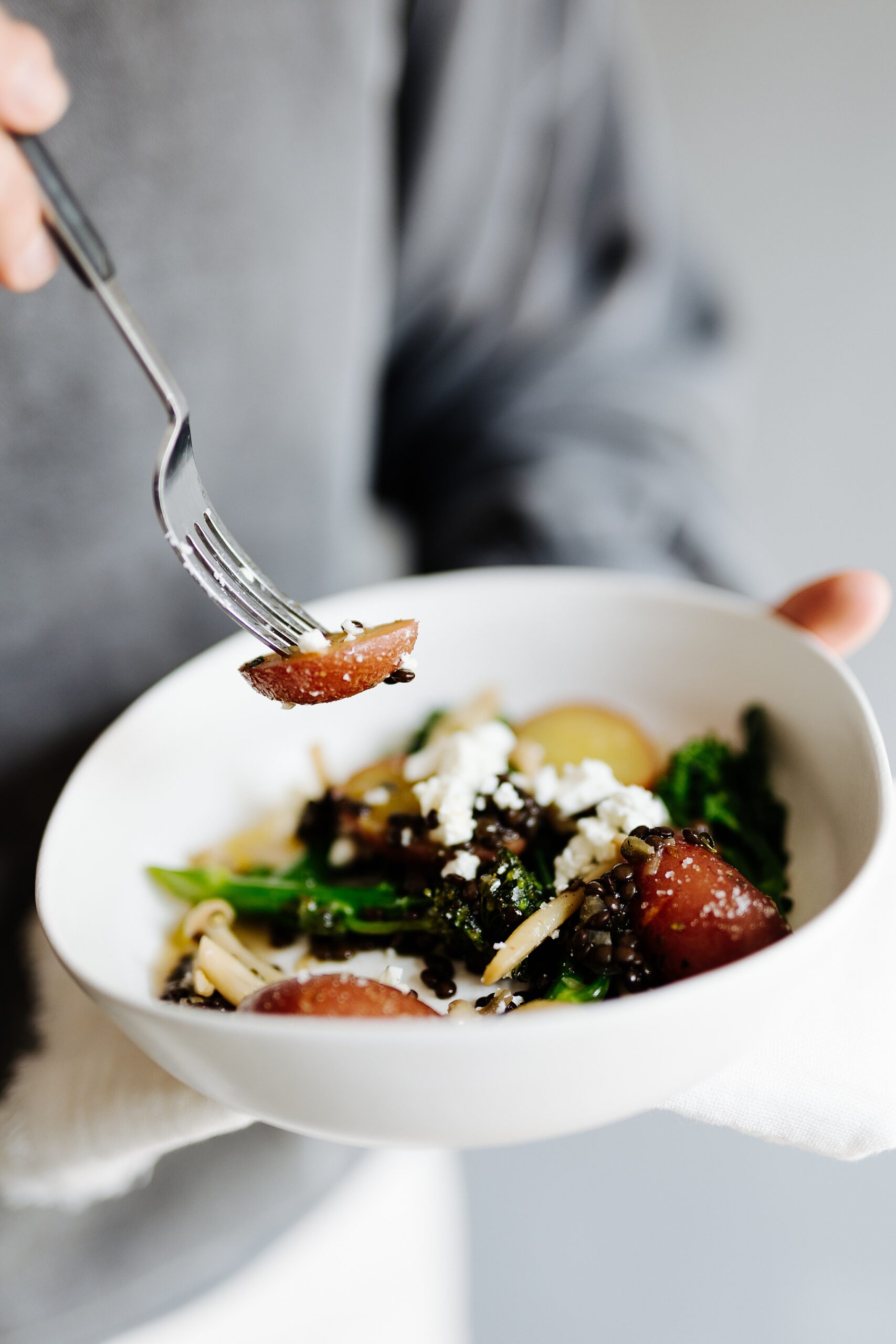 - Die warmen Kartoffeln und Linsen mit dem Pfannen Gemüse anrichten.