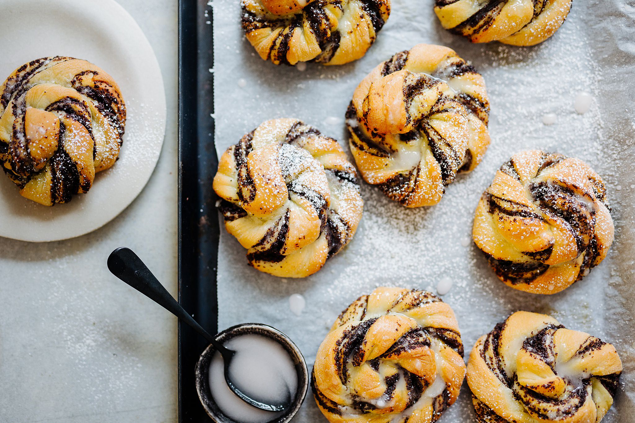 - Zwei Backbleche mit Backpapier auslegen und die Schnecken mit Abstand zueinander auflegen. Erneut ca. 1 Stunde gehen lassen.