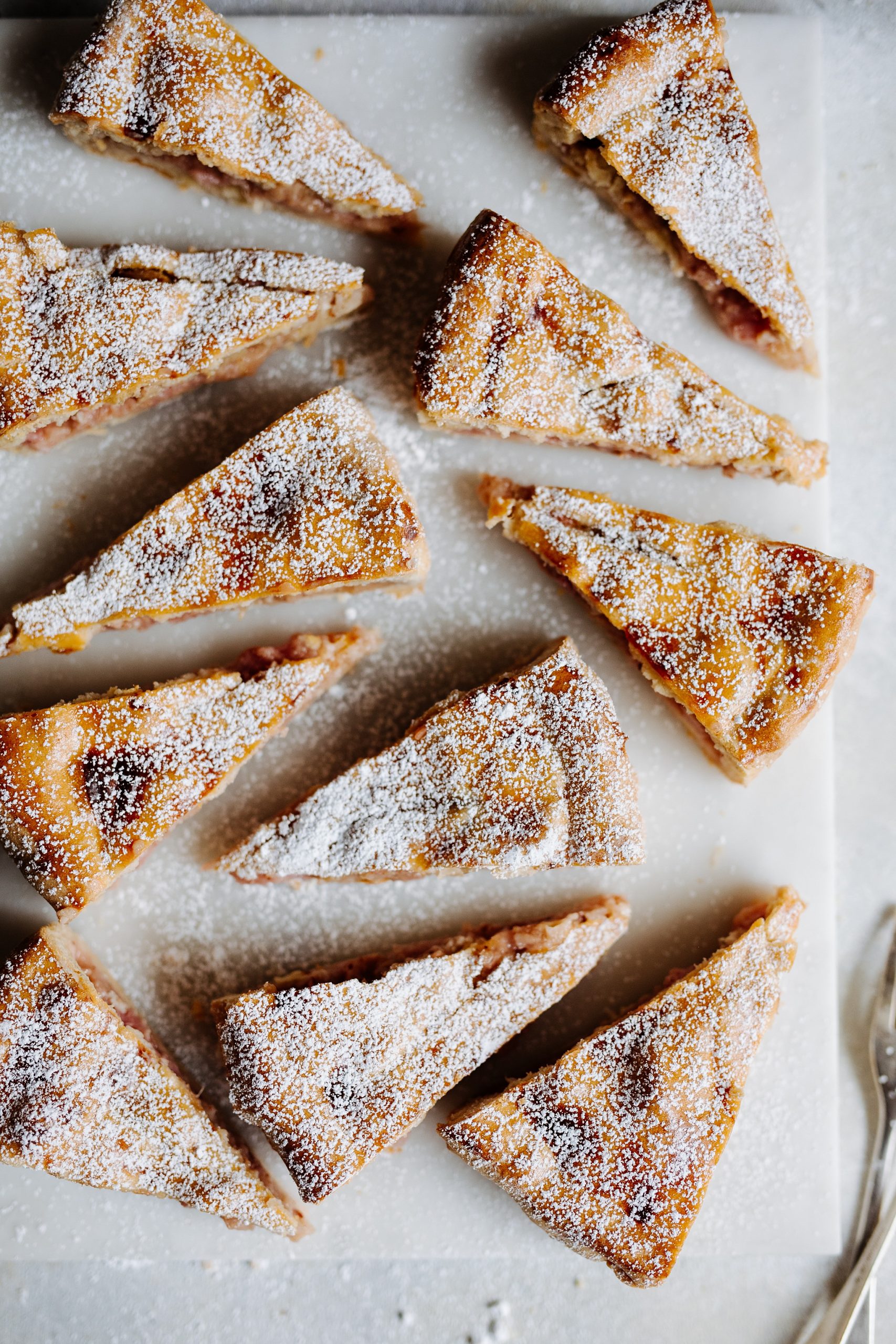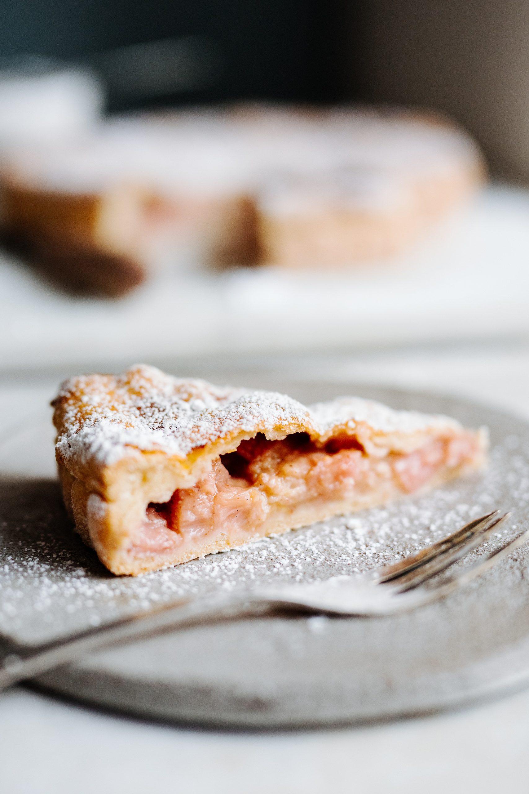 - Für die Füllung, Rhabarber mit Zitronen- schale und -saft, Zucker, Semmelbrösel, Mandeln und Gewürzen in einer Schüssel vermischen.