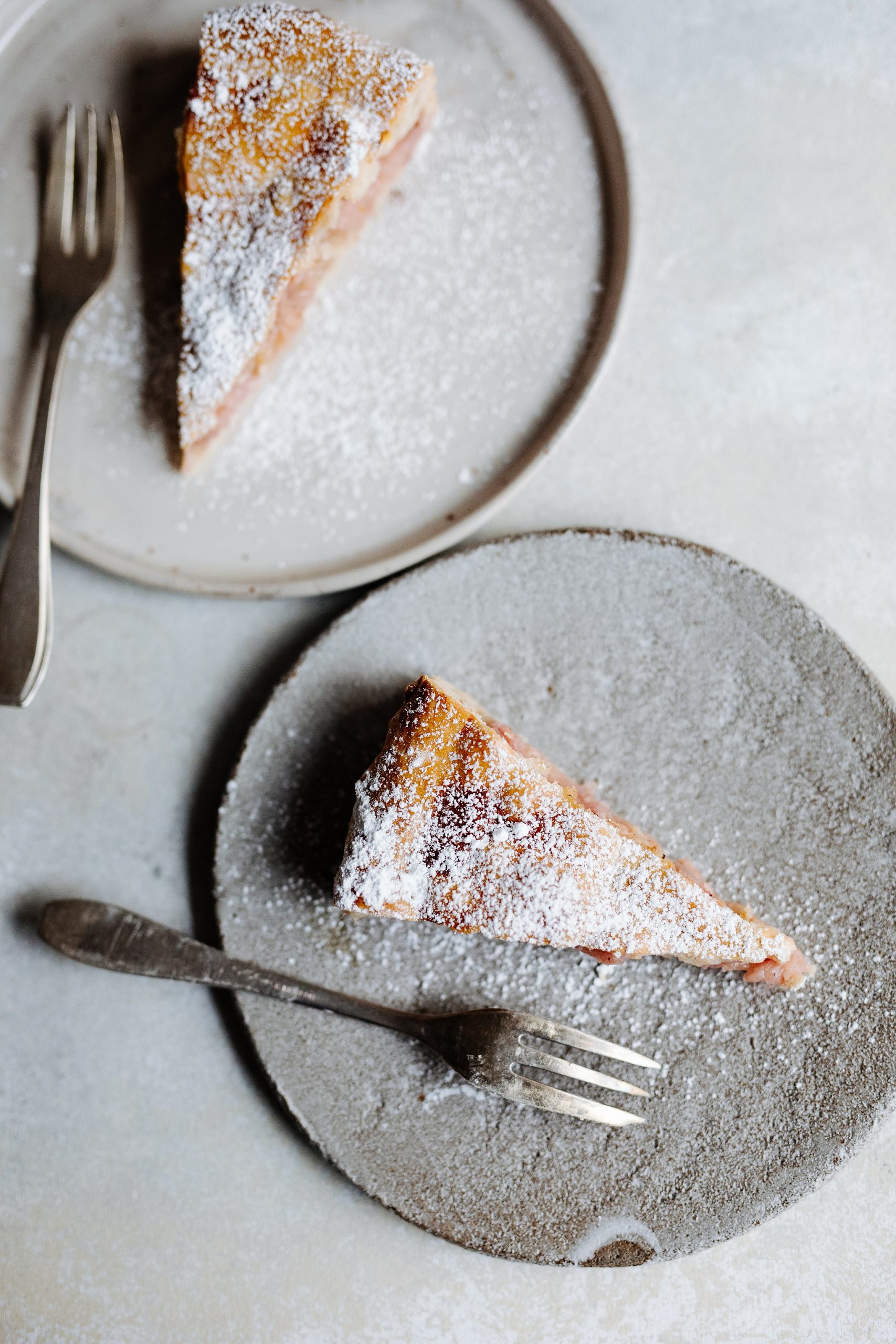 - Die Rhabarber Mischung gleichmäßig darauf verteilen.