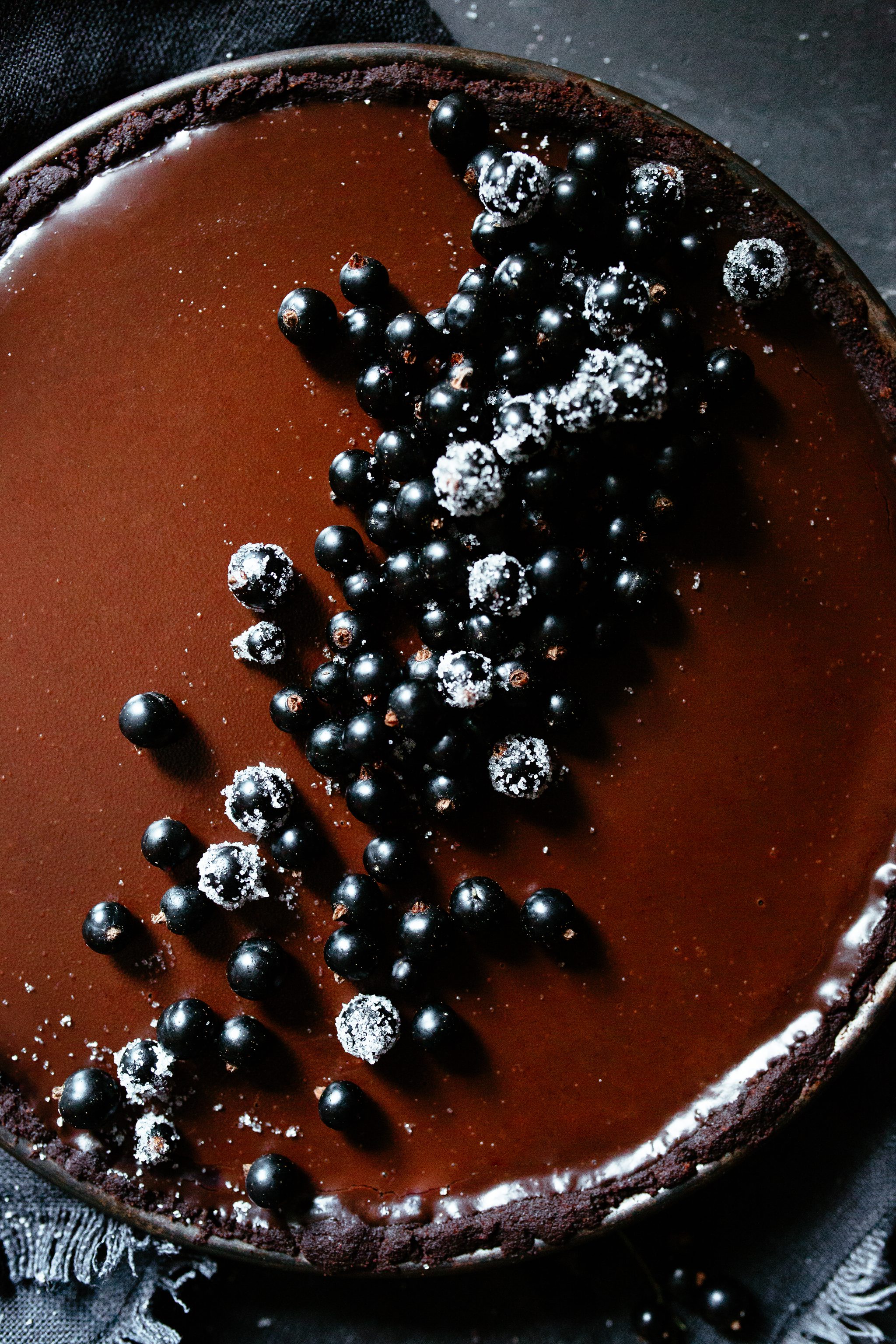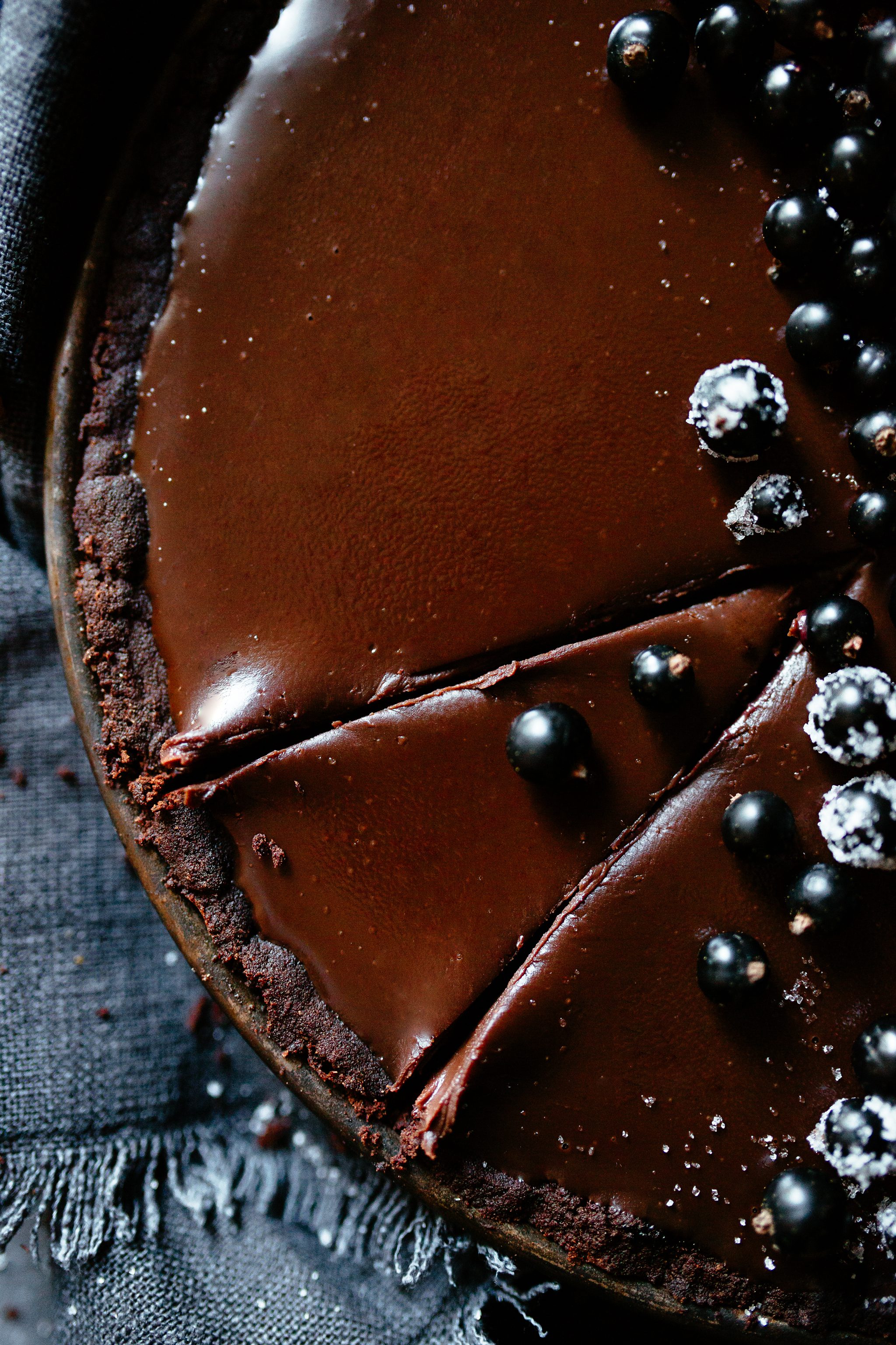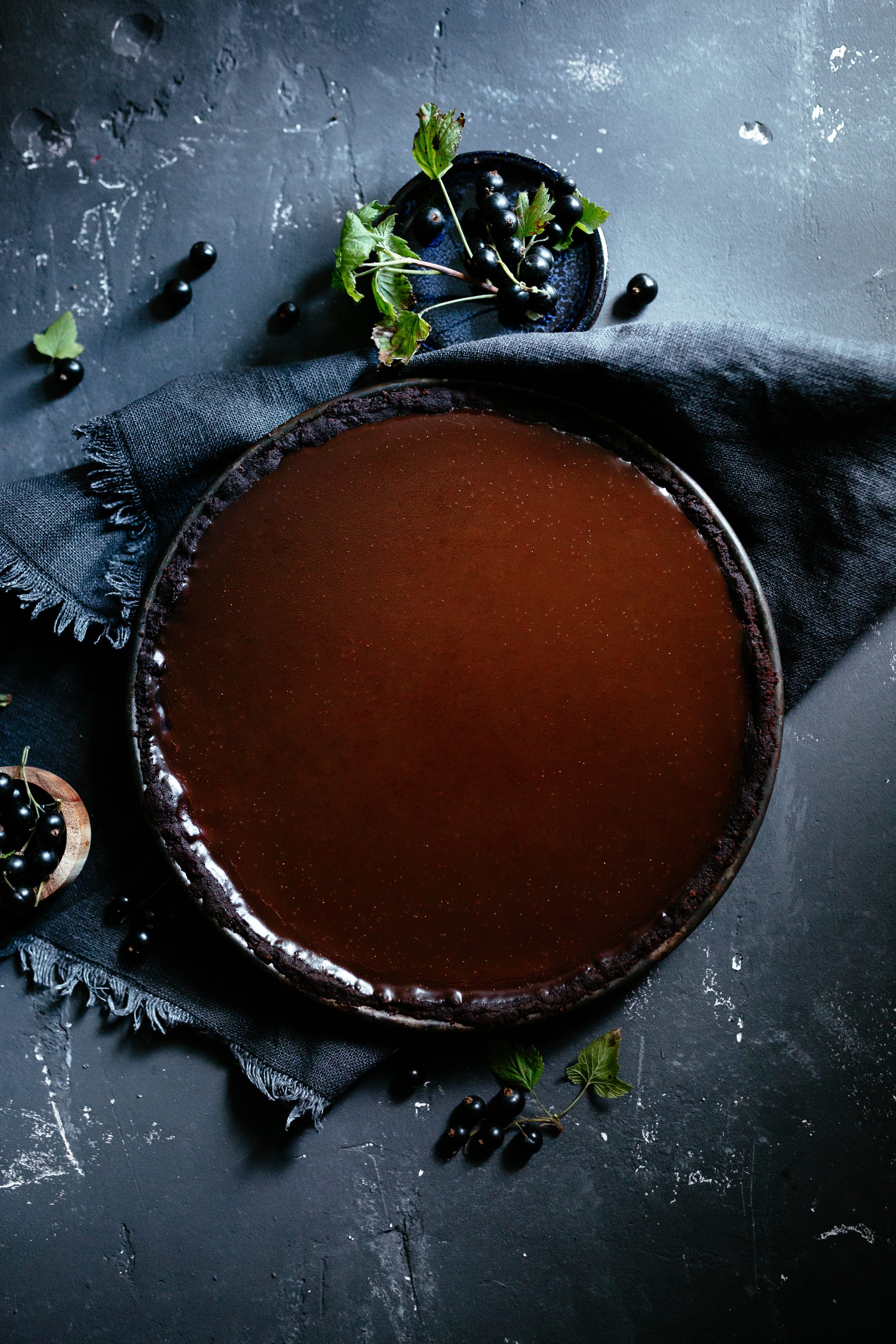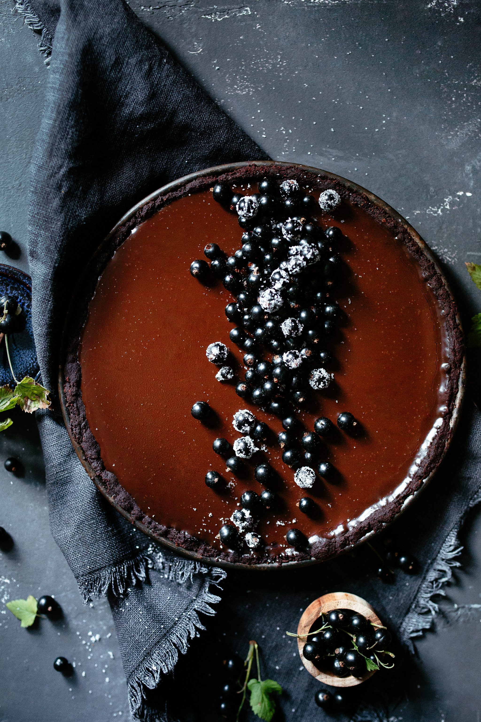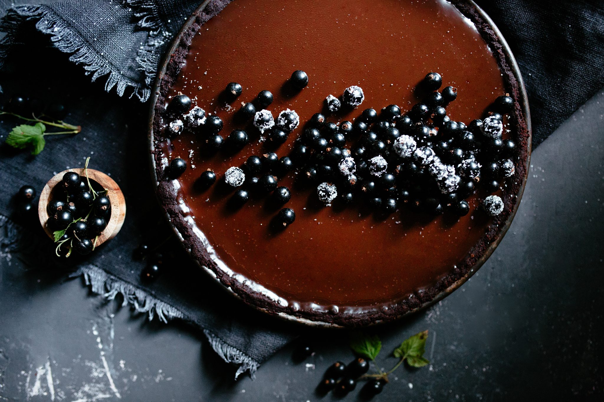 9. Die Tarte mit Johannisbeer Gelee bestreichen, 20 Minuten kühlen, dann die Schokolade darüber gießen und für mindestens 4 Stunden kühlen, besser noch über Nacht.