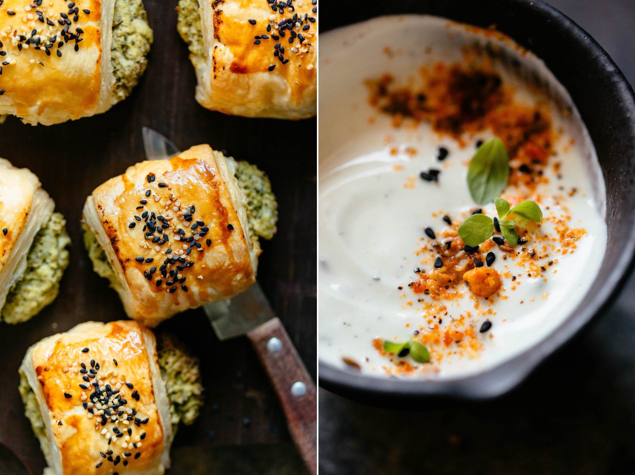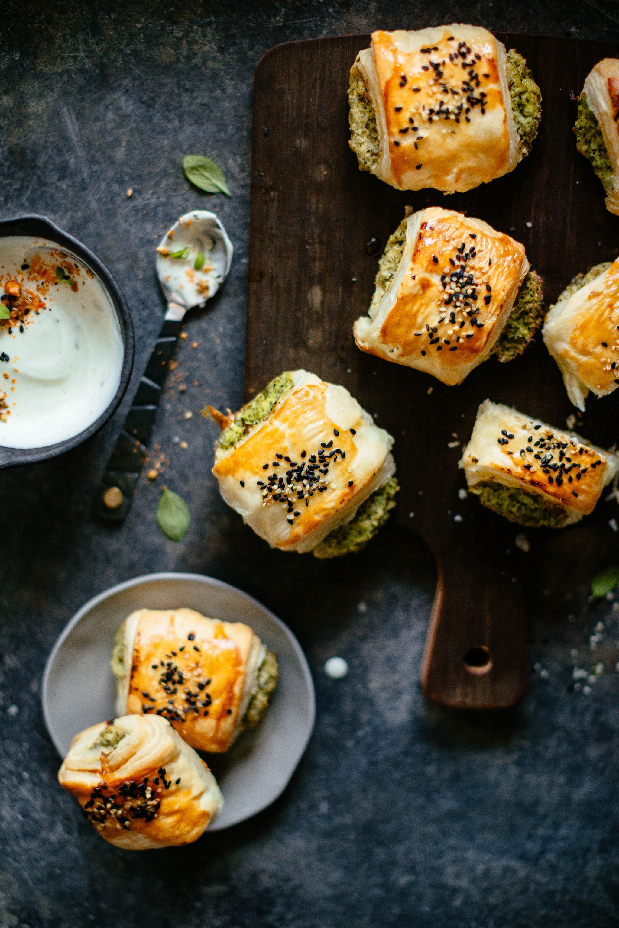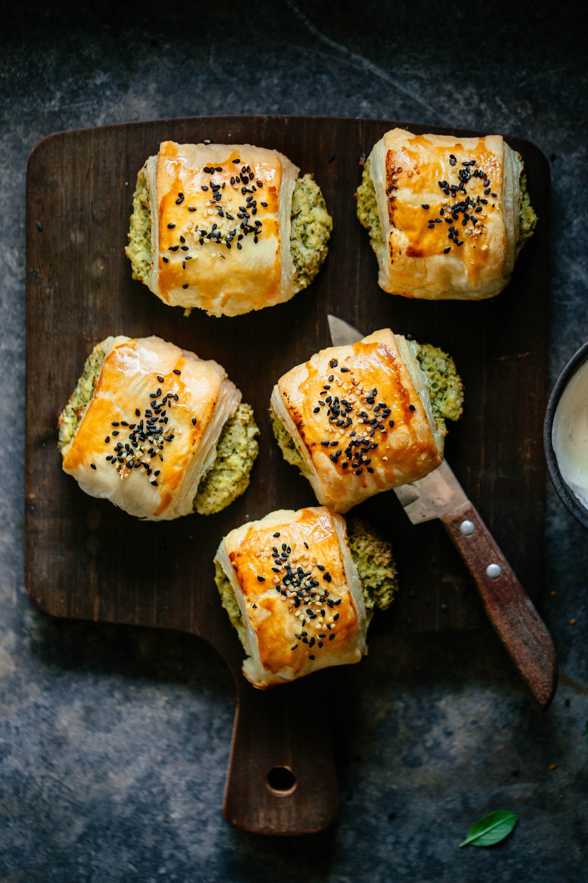5. In einer Schüssel die Zwiebel-Knoblauchmischung, Brokkoli frische Kräuter und Ricotta vermengen. Mit Salz und Pfeffer abschmecken. Blätterteig auf einer Arbeitsfläche auslegen.